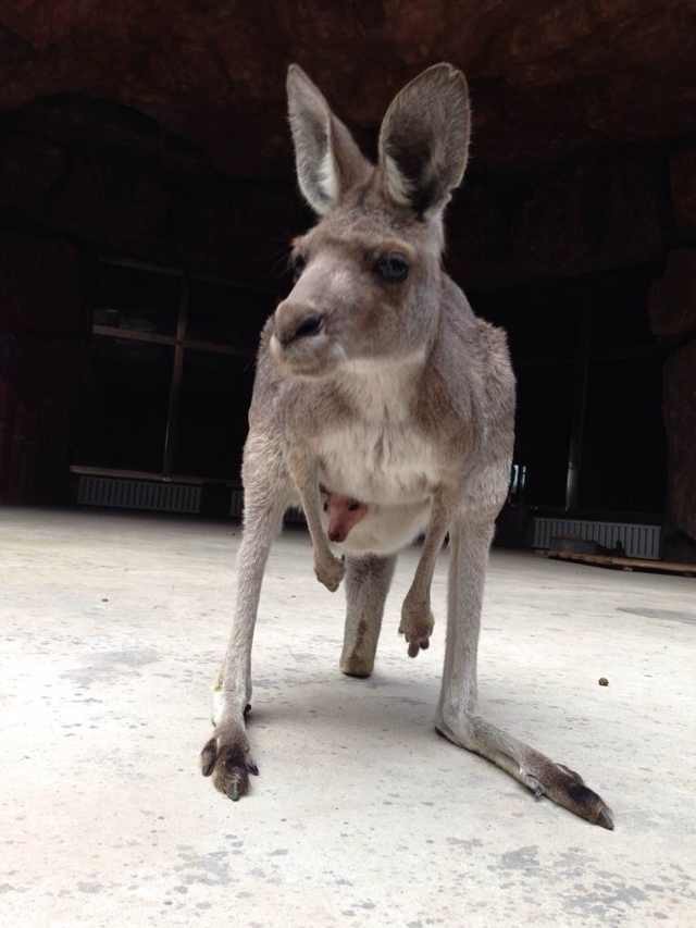 鄂爾多斯動物園從2012年5月份引進袋鼠至今,可謂喜事連連,先后繁育袋鼠2只,近日,經過飼養(yǎng)員的精心飼喂,今年新出生的小袋鼠也第一次露頭啦。