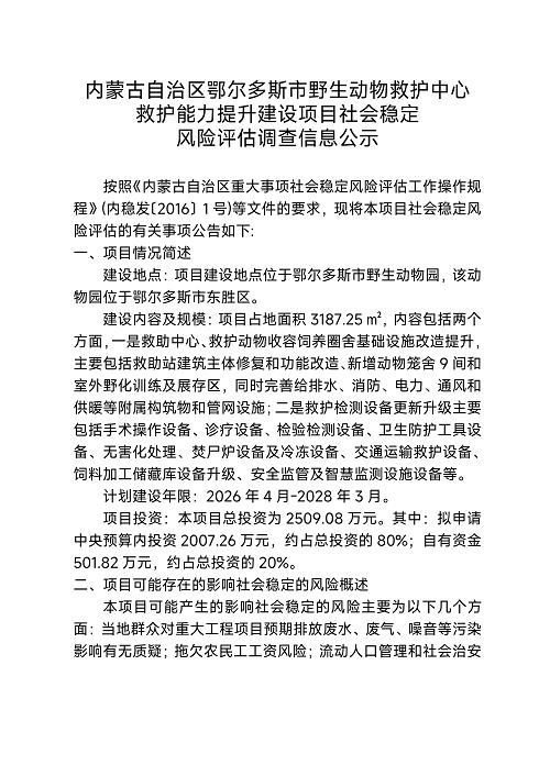 內(nèi)蒙古自治區(qū)鄂爾多斯市野生動(dòng)物救護(hù)中心救護(hù)能力提升建設(shè)項(xiàng)目社會(huì)穩(wěn)定風(fēng)險(xiǎn)評(píng)估調(diào)查信息公示