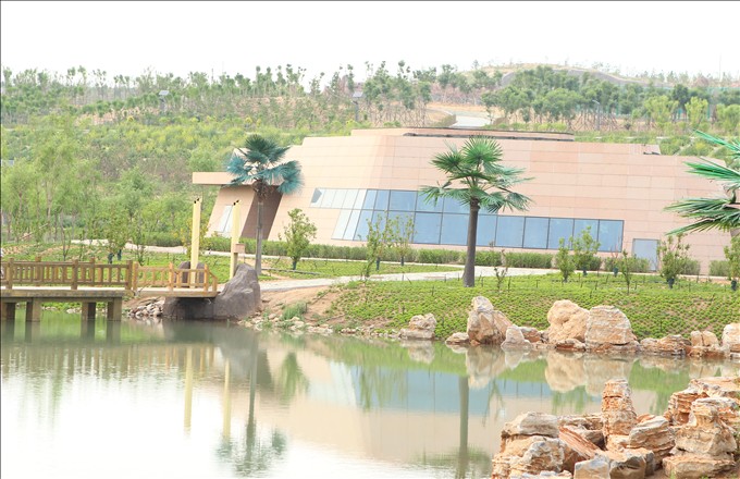 節(jié)尾狐猴館:位于雨林區(qū)的中心島上,介于火烈鳥(niǎo)與水禽苑之間,建筑面積400平方米,建筑高度4.5米。結(jié)構(gòu)形式為框架結(jié)構(gòu)。設(shè)計(jì)構(gòu)思為一塊水岸邊的被水沖刷的卵石,依形就勢(shì),融入自然。整個(gè)建筑外部干掛頁(yè)巖石材,令建筑感覺(jué)上渾然一體,宛若天成。內(nèi)部功能較為簡(jiǎn)單,分為展區(qū)及游客區(qū),之間采用景觀水分隔。